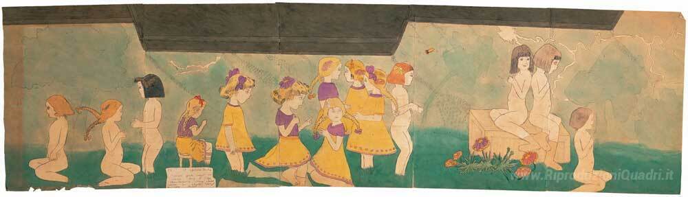 Ti offriamo una riproduzione artigianale su tela dell'opera famosa '56 A Jennie Richee. Vivian Girls catturati in furia folle di paz' di Henry Darger, dal Museo delle Riproduzioni.