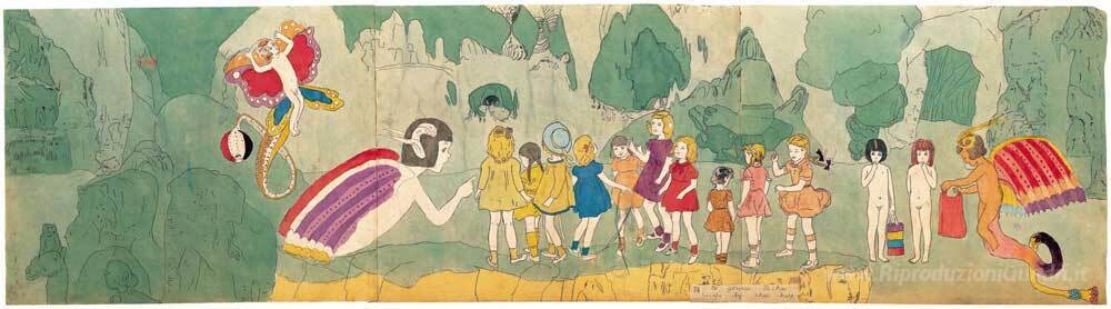 Ti offriamo una riproduzione artigianale su tela dell'opera famosa '73 A Jennie Richee Fuga per il loro aiuto' di Henry Darger, dal Museo delle Riproduzioni.