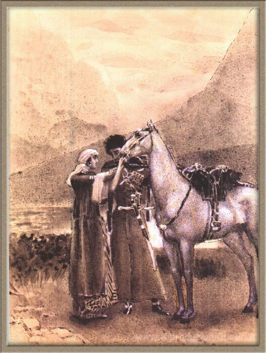 Ti offriamo una riproduzione artigianale su tela dell'opera famosa 'Addio di Zara con Ismail' di Mikhail Vrubel, dal Museo delle Riproduzioni.