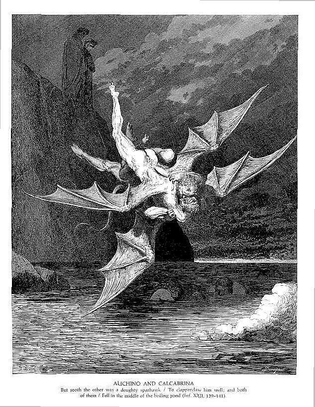 Ti offriamo una riproduzione artigianale su tela dell'opera famosa 'Alichino & Calcabrina' di Gustave Dore, dal Museo delle Riproduzioni.