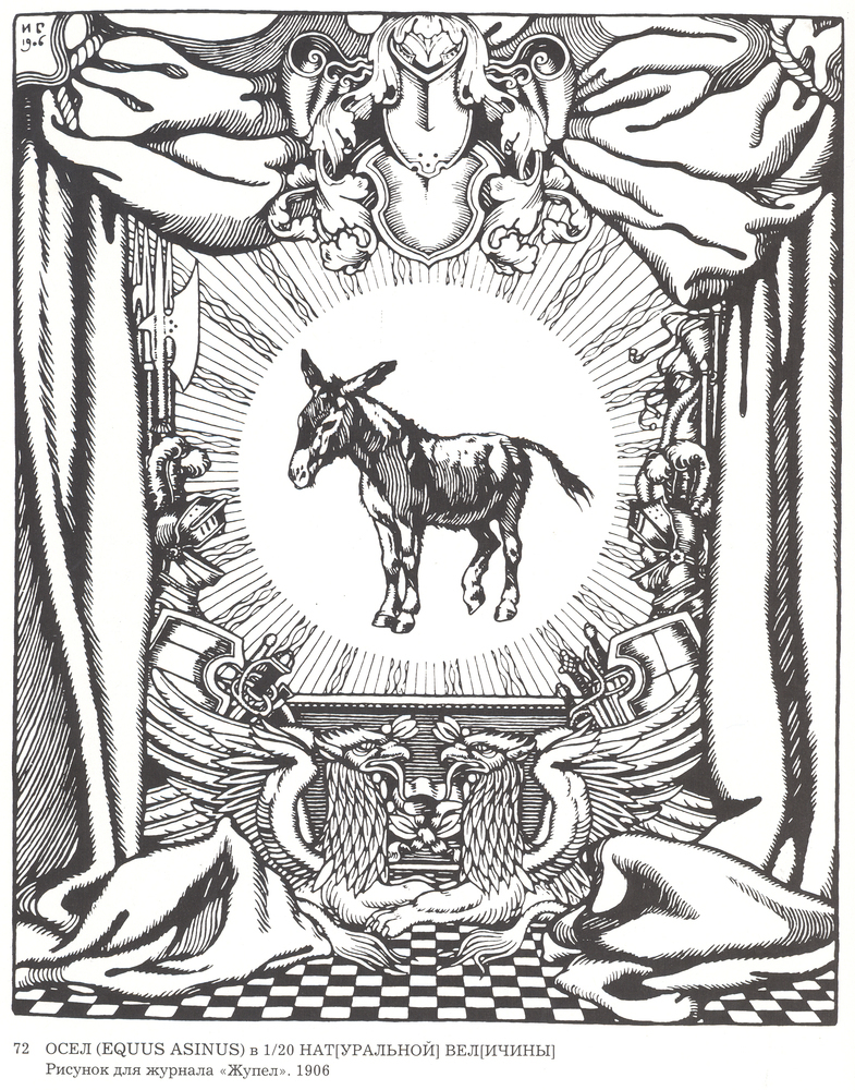 Ti offriamo una riproduzione artigianale su tela dell'opera famosa 'Asino, Illustrazione per la rivista Bogey' di Ivan Bilibin, dal Museo delle Riproduzioni.