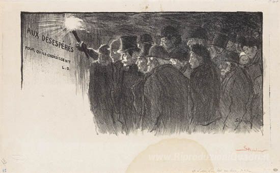 Ti offriamo una riproduzione artigianale su tela dell'opera famosa 'Aux Desesperes Pour Qu-ils Choisissent' di Theophile Steinlen, dal Museo delle Riproduzioni.