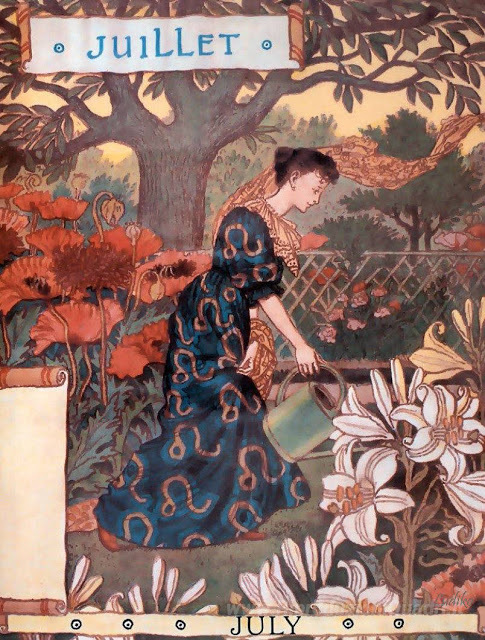 Ti offriamo una riproduzione artigianale su tela dell'opera famosa 'Belle Jardinière - Luglio' di Eugène Grasset, dal Museo delle Riproduzioni.