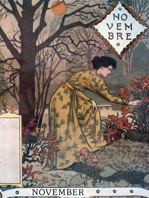 Ti offriamo una riproduzione artigianale su tela dell'opera famosa 'Belle Jardinière - Novembre' di Eugène Grasset, dal Museo delle Riproduzioni.