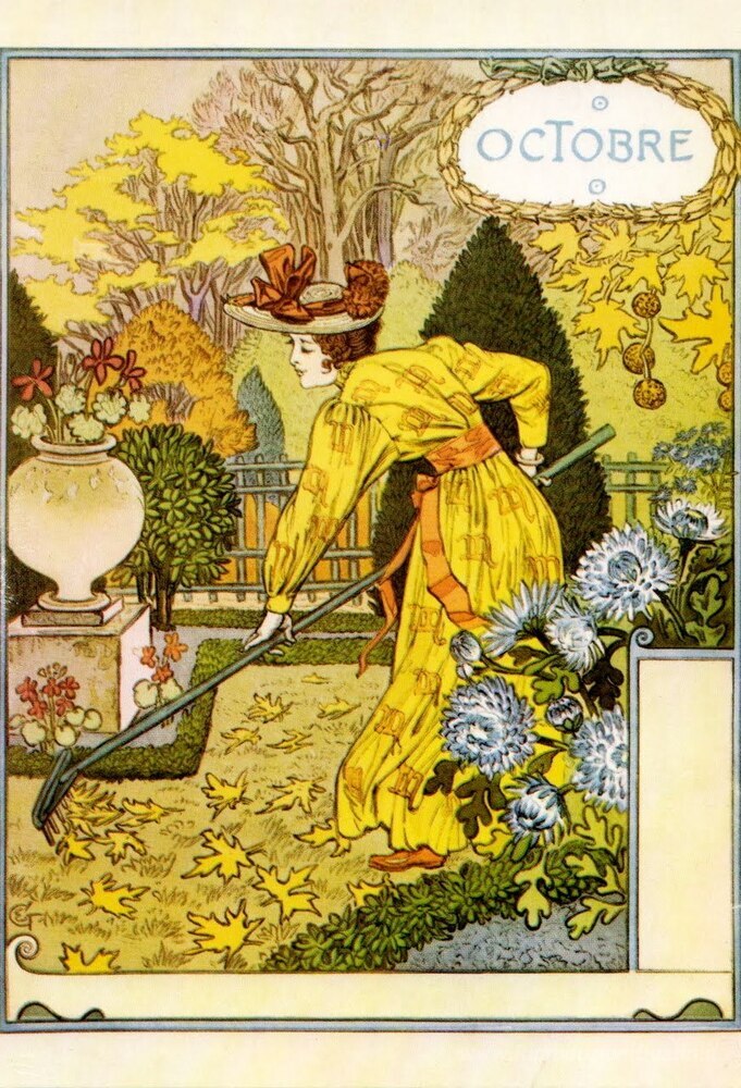 Ti offriamo una riproduzione artigianale su tela dell'opera famosa 'Belle Jardinière - Octobre' di Eugène Grasset, dal Museo delle Riproduzioni.