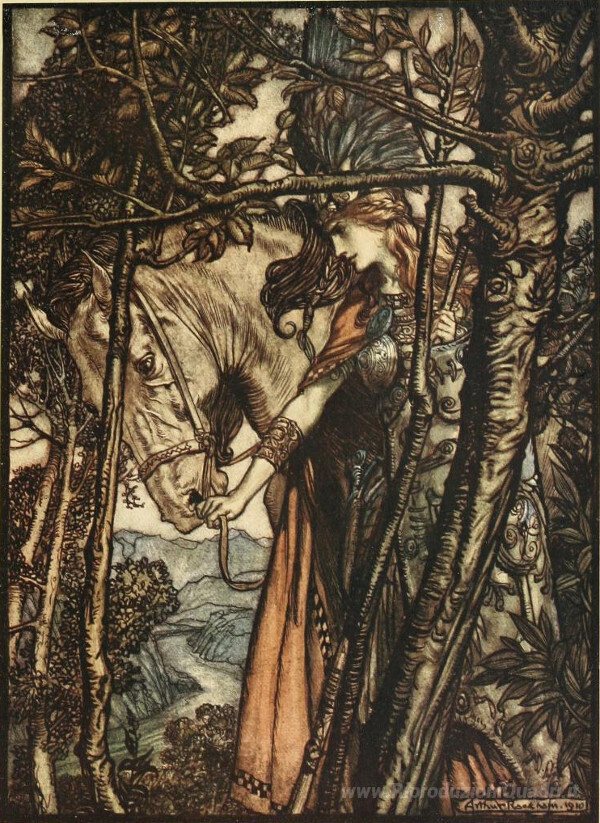 Ti offriamo una riproduzione artigianale su tela dell'opera famosa 'Brünnhilde lentamente e silenziosamente conduce il suo cavallo l' di Arthur Rackham, dal Museo delle Riproduzioni.