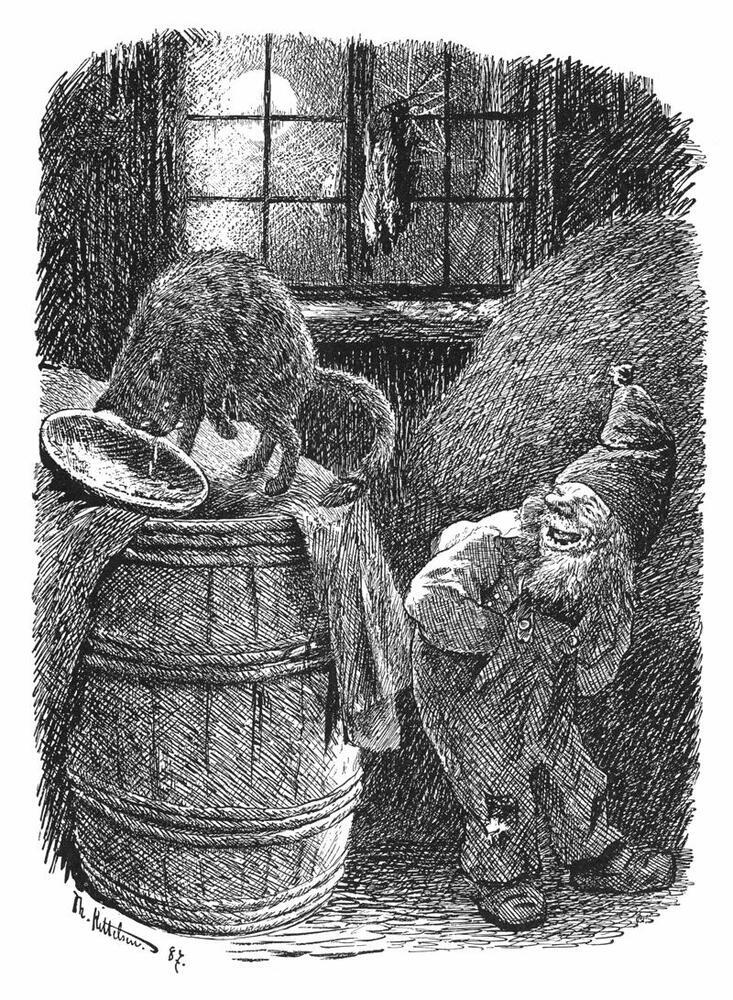 Ti offriamo una riproduzione artigianale su tela dell'opera famosa 'Brownie Mocks at the Cat' di Theodor Severin Kittelsen, dal Museo delle Riproduzioni.