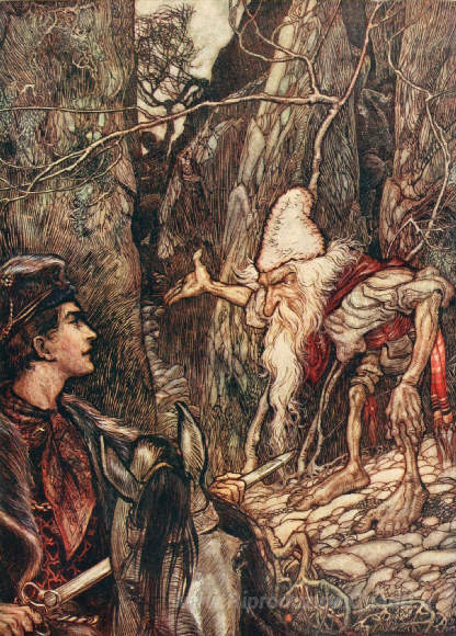 Ti offriamo una riproduzione artigianale su tela dell'opera famosa 'Buona Nano, si fa a non dirmi dove sono i miei fratelli' di Arthur Rackham, dal Museo delle Riproduzioni.