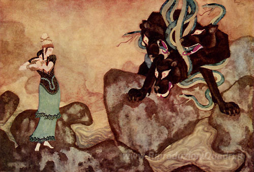 Ti offriamo una riproduzione artigianale su tela dell'opera famosa 'Cerburus, il Cane Nero dell'Ade - da Immagine del Libro per la C' di Edmund Dulac, dal Museo delle Riproduzioni.