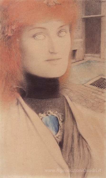 Ti offriamo una riproduzione artigianale su tela dell'opera famosa 'Chi mi tradirà?' di Fernand Khnopff, dal Museo delle Riproduzioni.