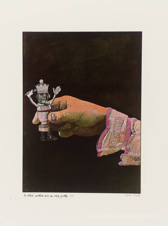 Ti offriamo una riproduzione artigianale su tela dell'opera famosa 'Così Alice lo prese molto delicatamente' di Peter Blake, dal Museo delle Riproduzioni.