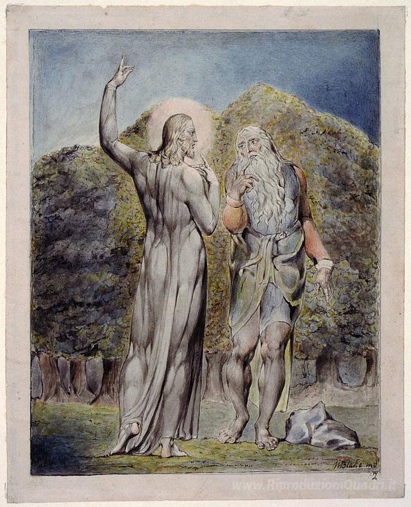 Ti offriamo una riproduzione artigianale su tela dell'opera famosa 'Cristo tentato da Satana per trasformare le pietre per pane' di William Blake, dal Museo delle Riproduzioni.