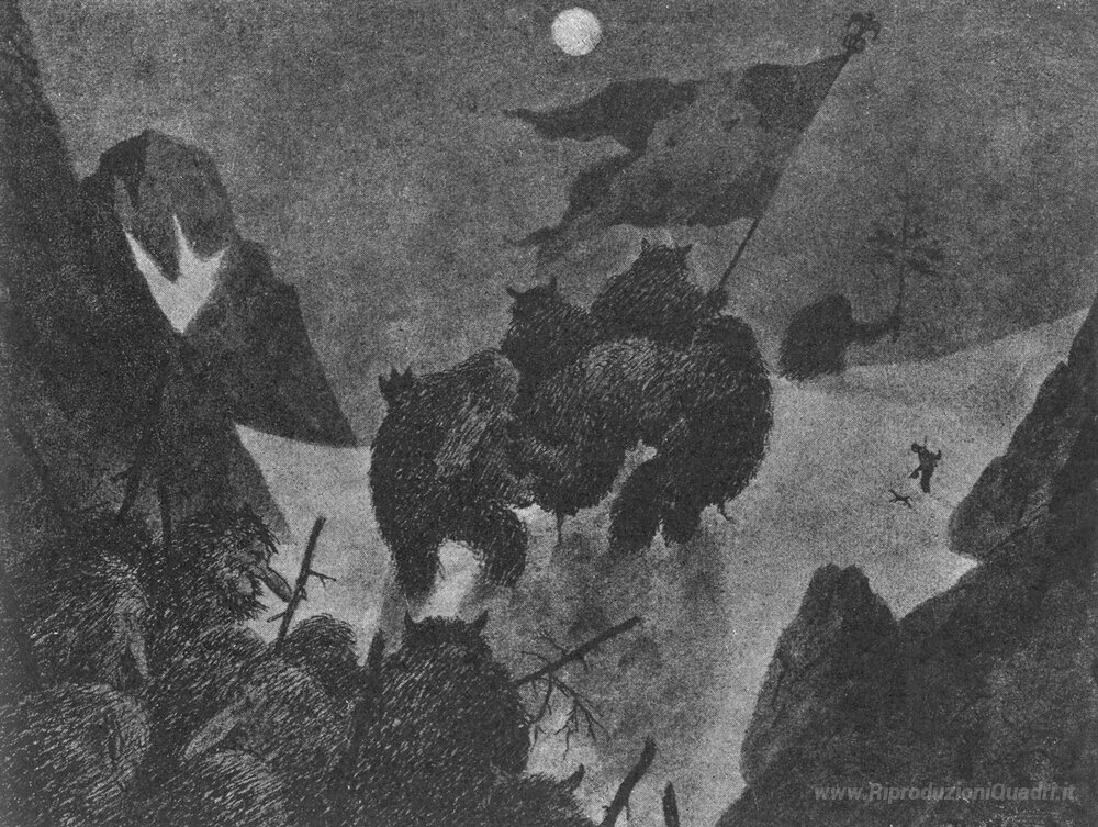 Ti offriamo una riproduzione artigianale su tela dell'opera famosa 'De Hadde Io Nattens Stillhet lurt Ham Vekk' di Theodor Severin Kittelsen, dal Museo delle Riproduzioni.