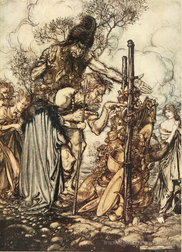Ti offriamo una riproduzione artigianale su tela dell'opera famosa 'Ehi! Vieni qui' di Arthur Rackham, dal Museo delle Riproduzioni.