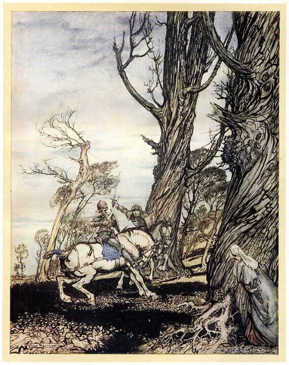 Ti offriamo una riproduzione artigianale su tela dell'opera famosa 'Erec viene attaccato nella foresta da un cavaliere sconosciuto' di Arthur Rackham, dal Museo delle Riproduzioni.