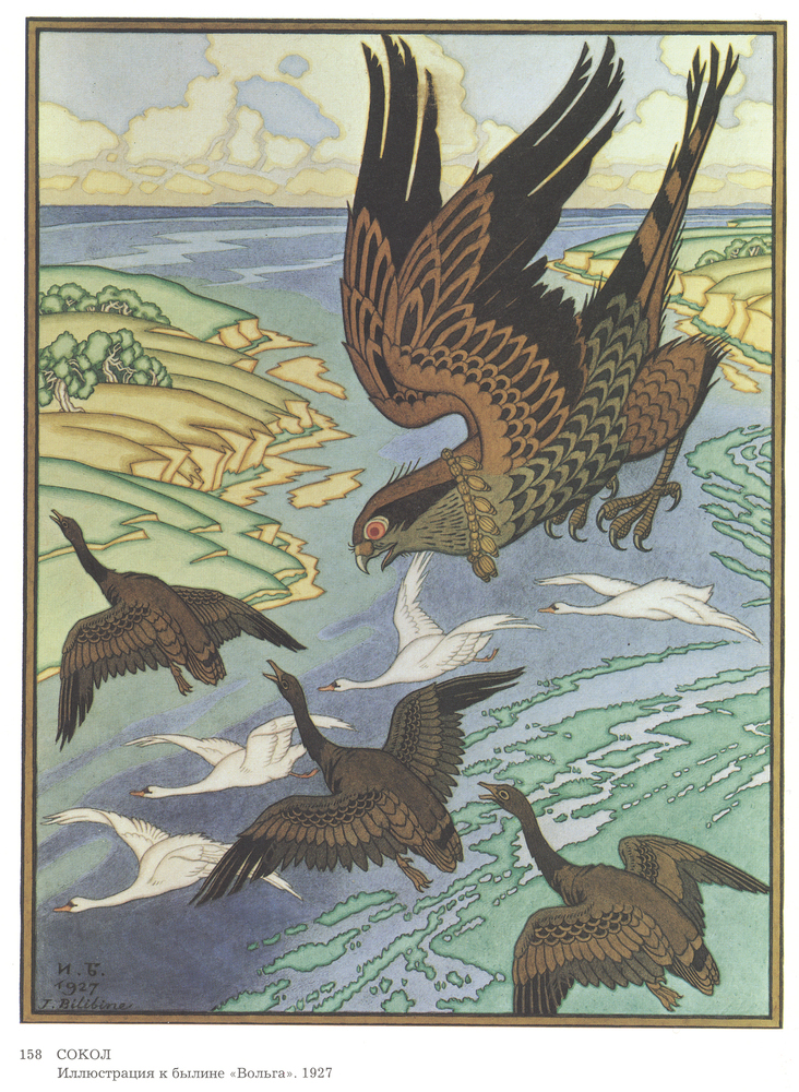 Ti offriamo una riproduzione artigianale su tela dell'opera famosa 'Falcon. Illustrazione per l'epica "Volga"' di Ivan Bilibin, dal Museo delle Riproduzioni.