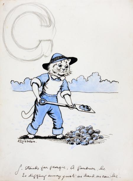 Ti offriamo una riproduzione artigianale su tela dell'opera famosa 'G sta per GEORGIE, un giardiniere. HE sta scavando VIA sodo come' di Louis Wain, dal Museo delle Riproduzioni.