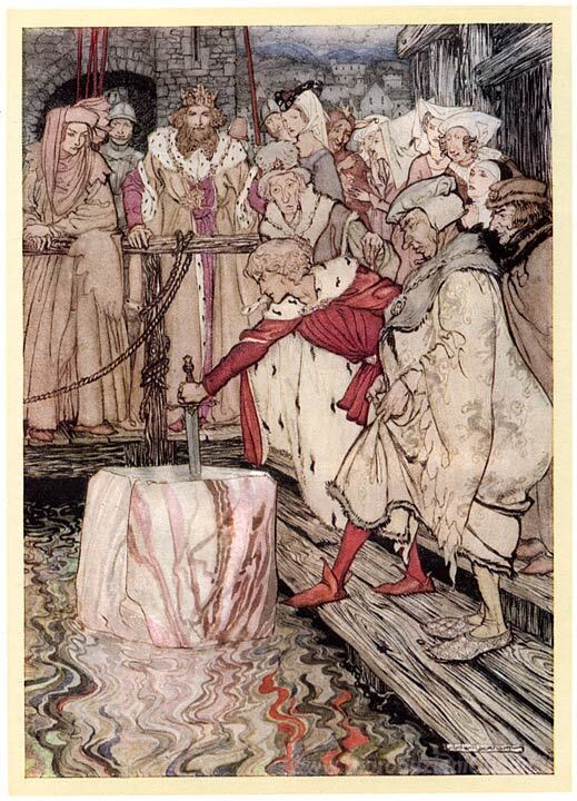 Ti offriamo una riproduzione artigianale su tela dell'opera famosa 'Galahad trae la spada dalla roccia galleggiante' di Arthur Rackham, dal Museo delle Riproduzioni.