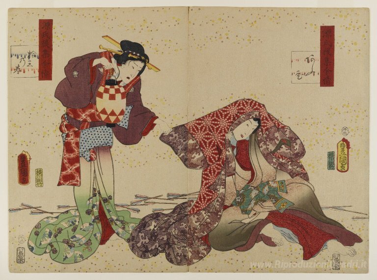 Ti offriamo una riproduzione artigianale su tela dell'opera famosa 'Genji' di Utagawa Kunisada, dal Museo delle Riproduzioni.
