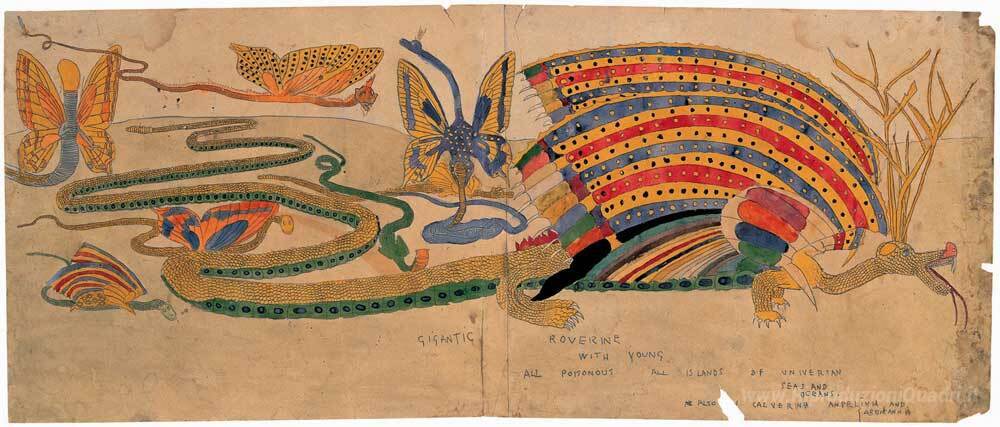 Ti offriamo una riproduzione artigianale su tela dell'opera famosa 'Gigantic Roverine ...' di Henry Darger, dal Museo delle Riproduzioni.