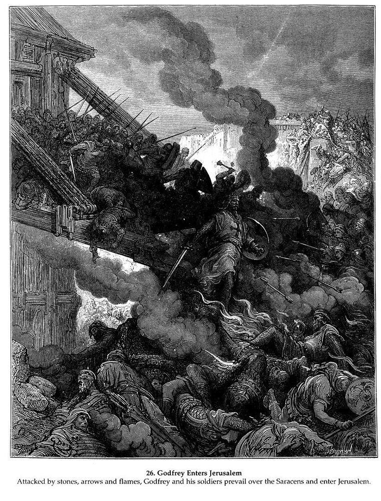 Ti offriamo una riproduzione artigianale su tela dell'opera famosa 'Godfrey entra in Gerusalemme' di Gustave Dore, dal Museo delle Riproduzioni.