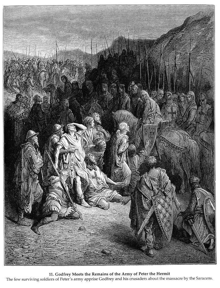 Ti offriamo una riproduzione artigianale su tela dell'opera famosa 'Godfrey incontra i resti dell'esercito di Pietro l'Eremita' di Gustave Dore, dal Museo delle Riproduzioni.
