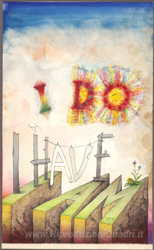 Ti offriamo una riproduzione artigianale su tela dell'opera famosa 'I Do, I Have, I Am' di Saul Steinberg, dal Museo delle Riproduzioni.