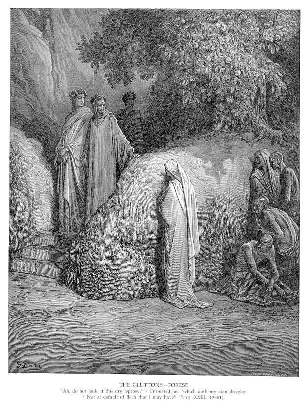 Ti offriamo una riproduzione artigianale su tela dell'opera famosa 'I golosi - Forese' di Gustave Dore, dal Museo delle Riproduzioni.