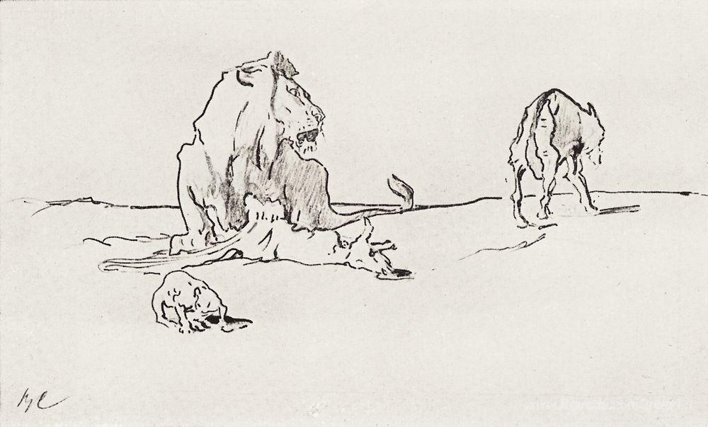 Ti offriamo una riproduzione artigianale su tela dell'opera famosa 'Il leone e il lupo' di Valentin Serov, dal Museo delle Riproduzioni.