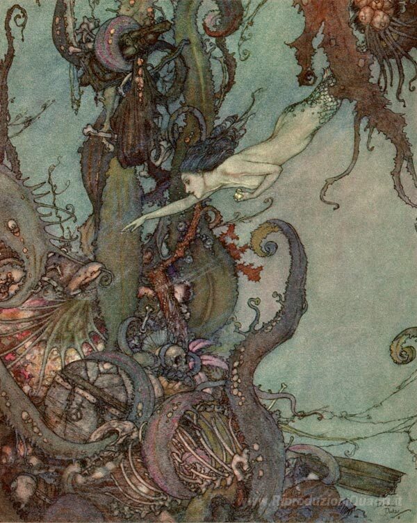 Ti offriamo una riproduzione artigianale su tela dell'opera famosa 'Il liquido luminoso' di Edmund Dulac, dal Museo delle Riproduzioni.
