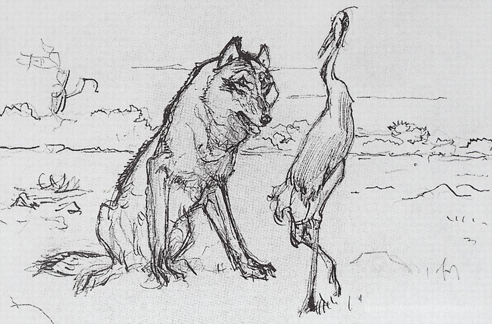 Ti offriamo una riproduzione artigianale su tela dell'opera famosa 'Il lupo e la gru' di Valentin Serov, dal Museo delle Riproduzioni.