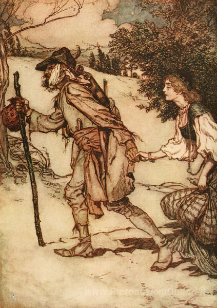 Ti offriamo una riproduzione artigianale su tela dell'opera famosa 'Il Mendicante la prese per mano e la condusse via' di Arthur Rackham, dal Museo delle Riproduzioni.
