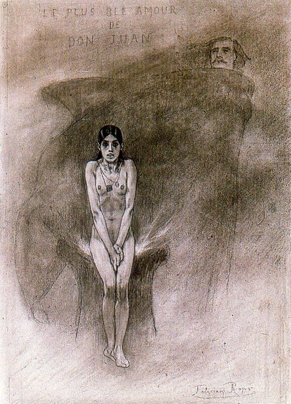 Ti offriamo una riproduzione artigianale su tela dell'opera famosa 'Il miglior amore di Don Giovanni' di Felicien Rops, dal Museo delle Riproduzioni.
