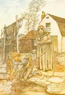 Ti offriamo una riproduzione artigianale su tela dell'opera famosa 'Il pescatore e sua moglie non avevano figli, ed erano solo nosta' di Arthur Rackham, dal Museo delle Riproduzioni.