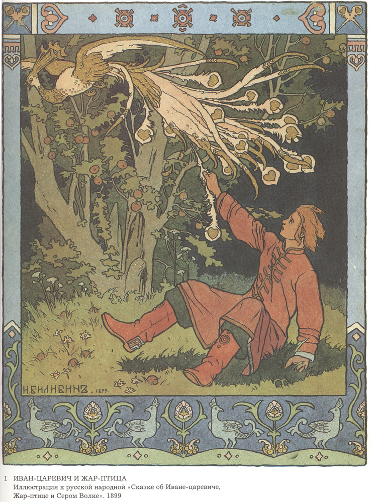 Ti offriamo una riproduzione artigianale su tela dell'opera famosa 'Il principe Ivan e l'uccello di fuoco, illustrazione per la Fata' di Ivan Bilibin, dal Museo delle Riproduzioni.