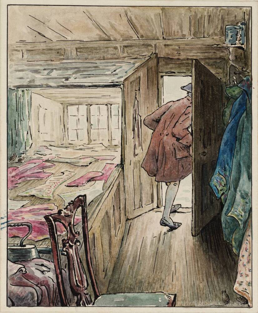 Ti offriamo una riproduzione artigianale su tela dell'opera famosa 'Il sarto Lasciando il suo Laboratorio' di Beatrix Potter, dal Museo delle Riproduzioni.