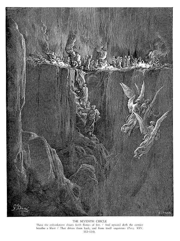 Ti offriamo una riproduzione artigianale su tela dell'opera famosa 'Il Settimo Circolo' di Gustave Dore, dal Museo delle Riproduzioni.