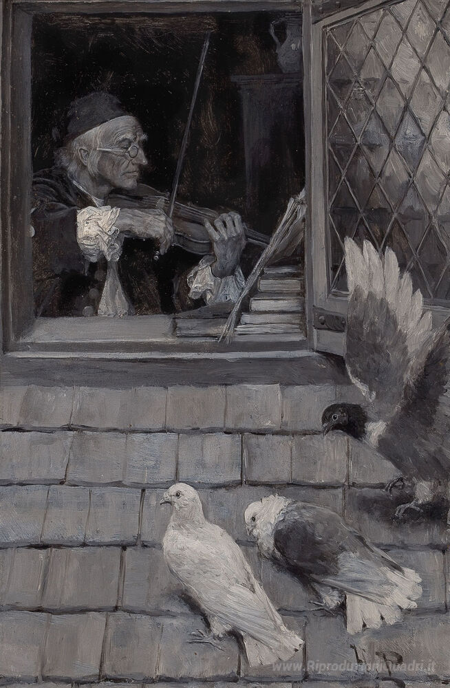 Ti offriamo una riproduzione artigianale su tela dell'opera famosa 'Il vecchio violino' di Howard Pyle, dal Museo delle Riproduzioni.