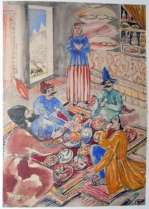 Ti offriamo una riproduzione artigianale su tela dell'opera famosa 'Illustrazione a 'racconti popolari armeni'' di Martiros Saryan, dal Museo delle Riproduzioni.