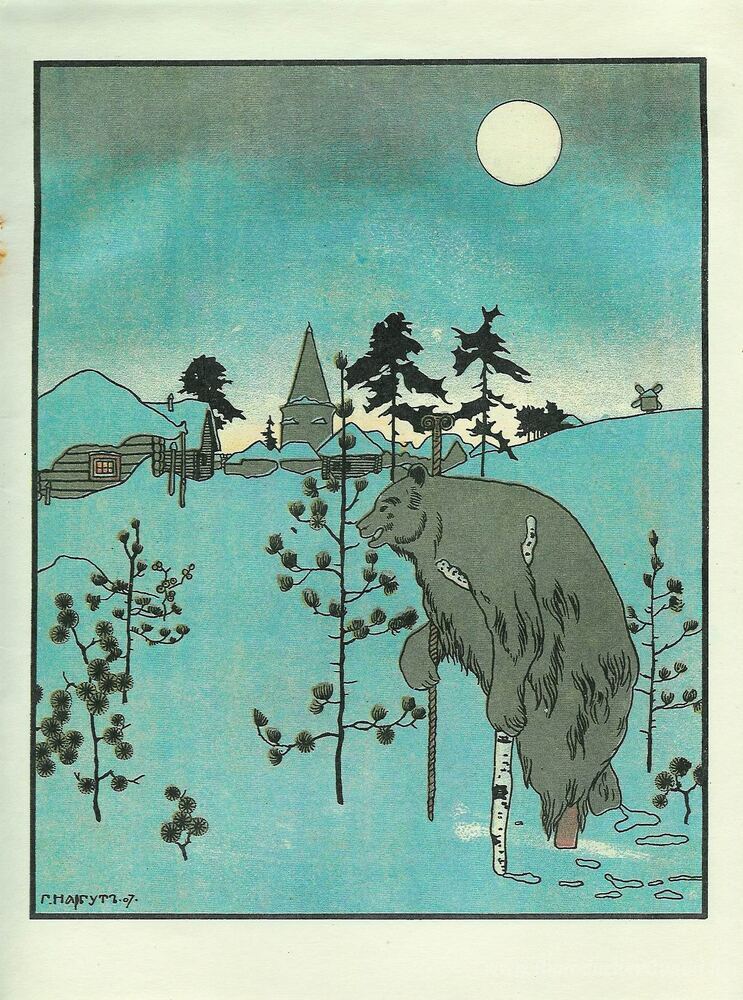 Ti offriamo una riproduzione artigianale su tela dell'opera famosa 'Illustrazione di 'La gru e aironi. Orso '.' di Heorhiy Narbut, dal Museo delle Riproduzioni.