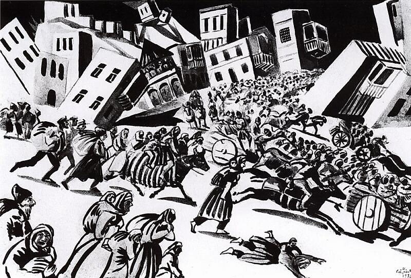 Ti offriamo una riproduzione artigianale su tela dell'opera famosa 'Illustrazione di Yeghishe Charents '"Paese di Nairi" - Fuga di n' di Martiros Saryan, dal Museo delle Riproduzioni.