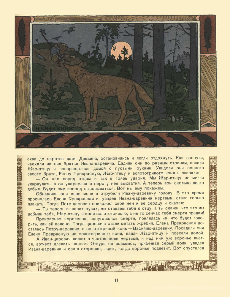Ti offriamo una riproduzione artigianale su tela dell'opera famosa 'Illustrazione per il racconto del principe Ivan, L'uccello di fu' di Ivan Bilibin, dal Museo delle Riproduzioni.