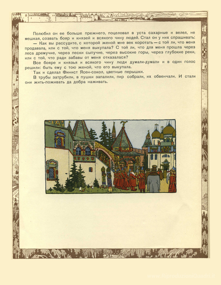 La tecnica di Bilibin, che comprende l'uso di inchiostri e acquerelli, crea un'atmosfera onirica e affascinante, perfetta per arricchire qualsiasi spazio. L'opera non solo porta un tocco di eleganza e cultura in casa tua, ma stimola anche la nostra immaginazione, rendendo ogni ambiente unico e speciale. Aggiungi la bellezza di questa illustrazione al tuo arredo, trasformando il tuo spazio in un racconto da vivere.