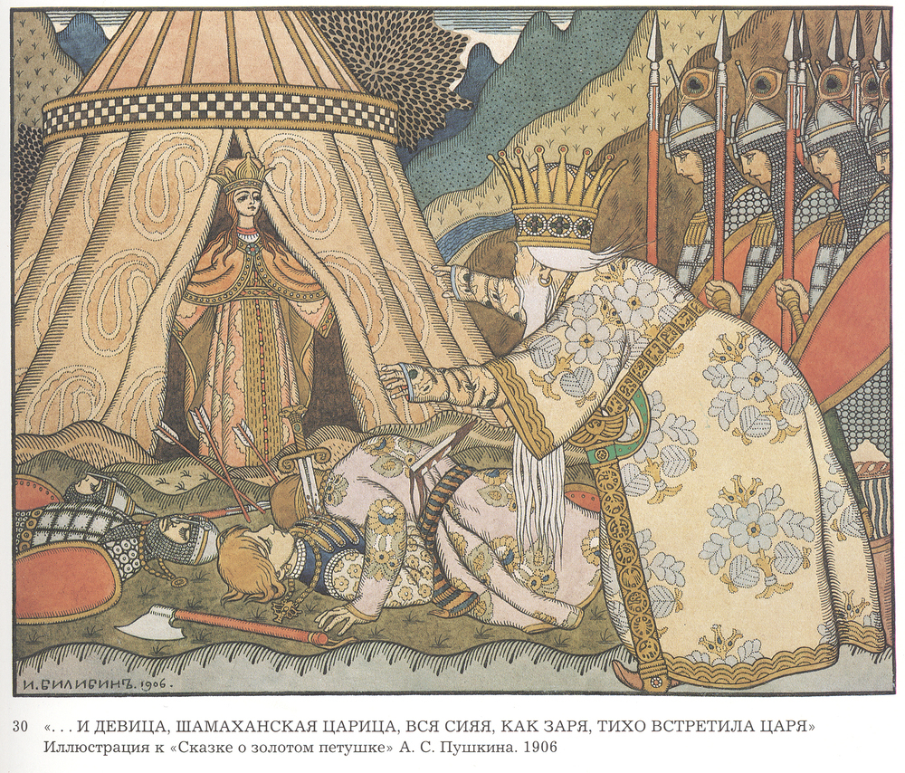 Le tecniche artistiche di Bilibin combinano elementi tradizionali con un'interpretazione moderna, conferendo a ogni dipinto una forte identità. L'Illustrazione per la poesia 'Il Racconto del Galletto non è solo un'opera d'arte, ma un elemento d'arredo che trasforma l'atmosfera di qualsiasi spazio, arricchendo il tuo ambiente con la sua bellezza e il suo messaggio profondo. Scegliere questa opera significa invitare in casa tua un pezzo di storia e cultura, capace di ispirare e meravigliare chiunque lo osservi.