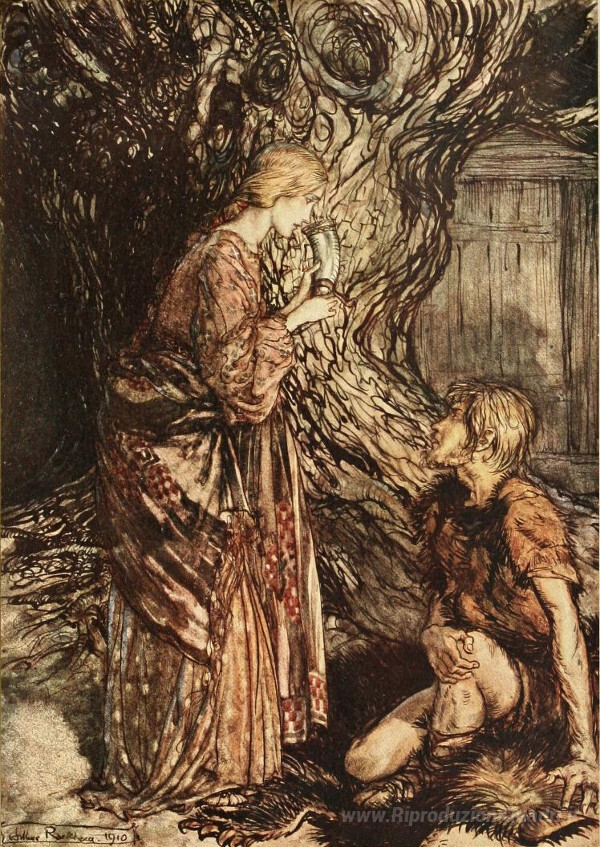 Ti offriamo una riproduzione artigianale su tela dell'opera famosa 'Impostare la prima a tue labbra' di Arthur Rackham, dal Museo delle Riproduzioni.