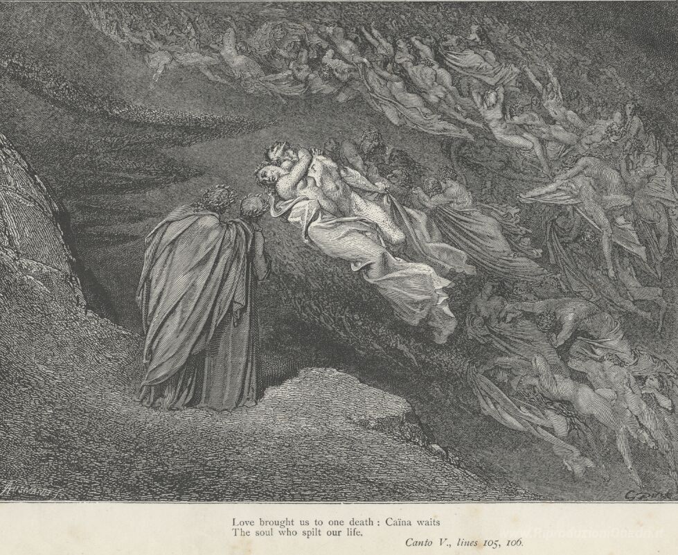 Ti offriamo una riproduzione artigianale su tela dell'opera famosa 'Inferno Canto 5' di Gustave Dore, dal Museo delle Riproduzioni.