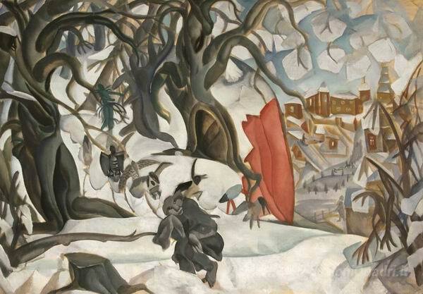 Ti offriamo una riproduzione artigianale su tela dell'opera famosa 'Inverno. Red Hill nel regno di Berendey' di Boris Grigoriev, dal Museo delle Riproduzioni.