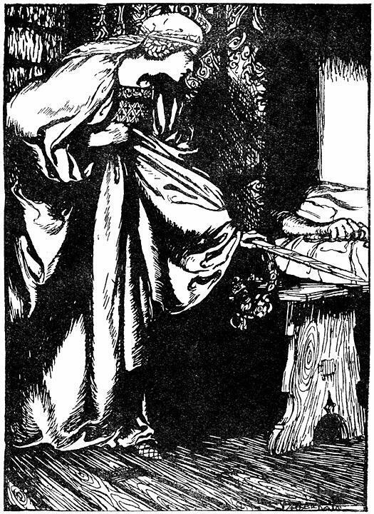 Ti offriamo una riproduzione artigianale su tela dell'opera famosa 'Isolde scopre la tacca nella spada di Tristano' di Arthur Rackham, dal Museo delle Riproduzioni.
