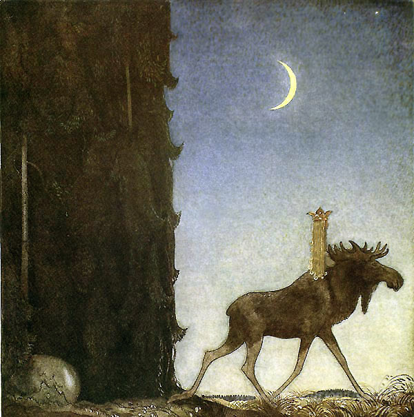 Ti offriamo una riproduzione artigianale su tela dell'opera famosa 'Jbleap l'alce' di John Bauer, dal Museo delle Riproduzioni.