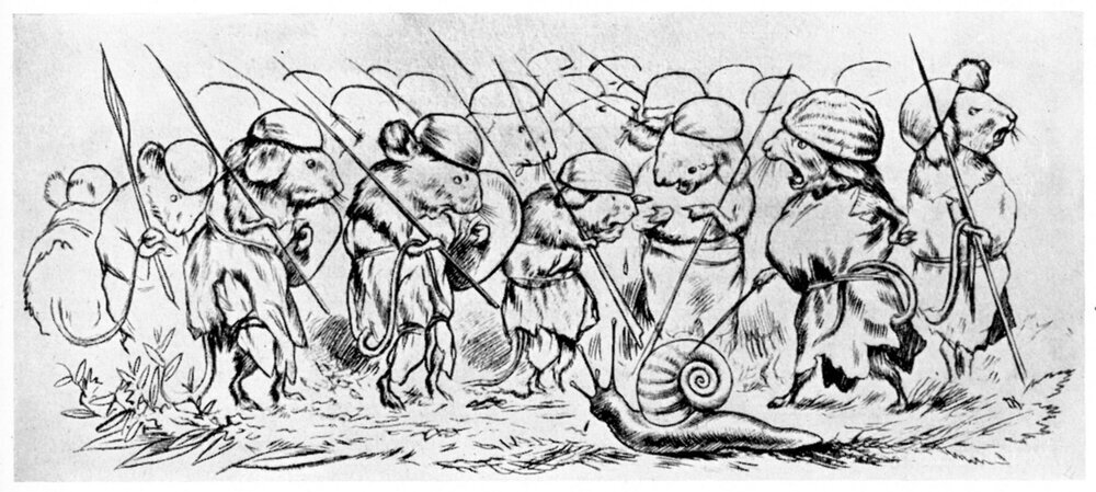 Ti offriamo una riproduzione artigianale su tela dell'opera famosa 'Krigen Mellom Froskene Og Musene 06' di Theodor Severin Kittelsen, dal Museo delle Riproduzioni.